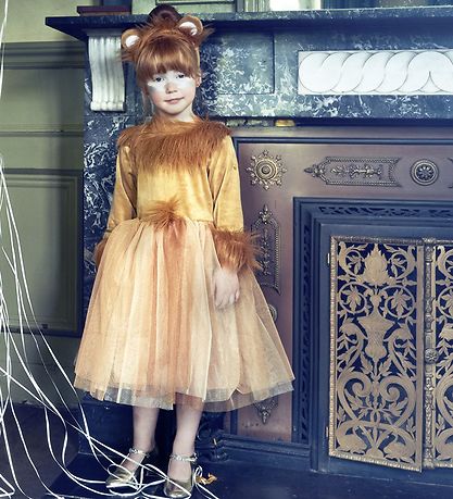 Beautiful Souza costume depicting a lion in brown, soft polyester. The dress has reddish brown imitation fur at the arm and neck openings as well as at the waistline, and the skirt consists of beige and brown tulle. On the left sleeve there is an embroidered, gold crown, and around both sleeves there is a nice gold detail. On the back, there is a small tail on the skirt. The headband comes with cute tiger ears with a white center and a sweet mane.