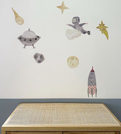 Fine That's Mine wallstickers with the motif of space with an astronaut, a rumraket, a ufo, comets, stars etc. in separate wallstickers.