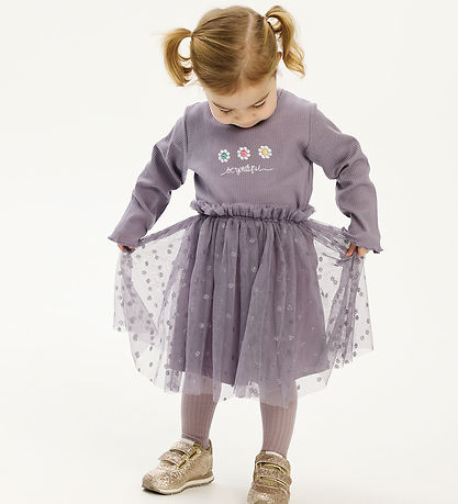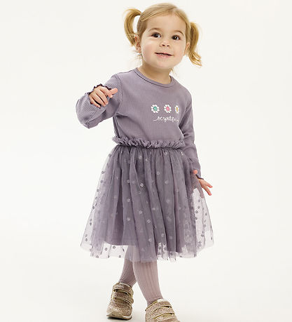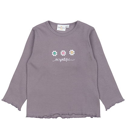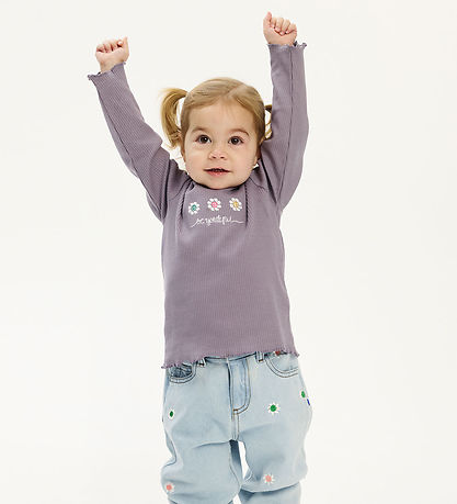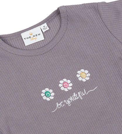Cute blouse from The New Siblings in a beautiful purple ribbed quality. The Blouse has fine embroidered flowers and text on the front and decorative wavy roundings at the sleeves and waist.