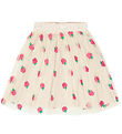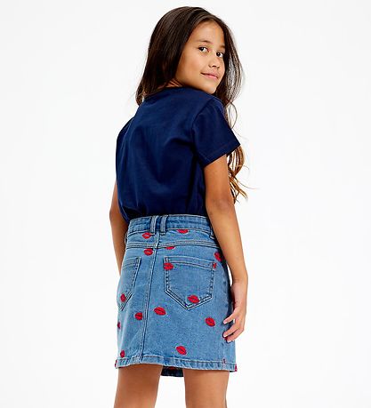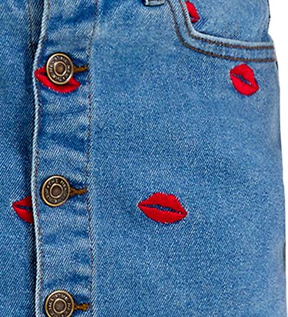 Smart The New skirt in blue denim in an extra stretchy quality and with red, embroidered lips.