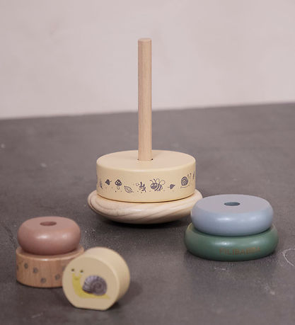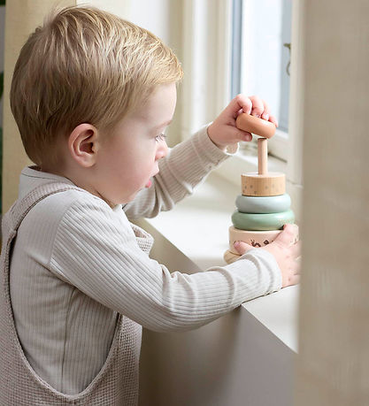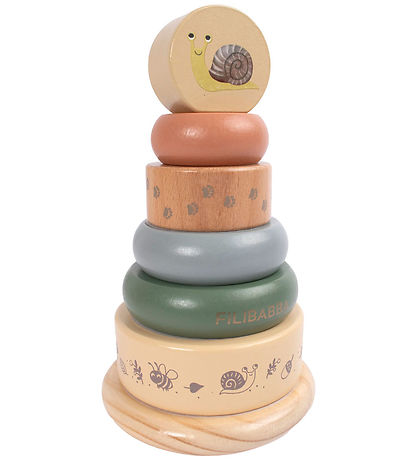 The Filibabba stacking tower consists of a rocking base with a round stick on which the rings are placed. There are a total of six rings in different colours and sizes, which can be Fast around the stick with a round block on top.