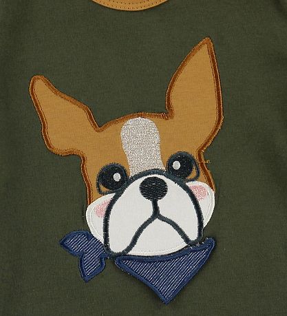 Cute Fred's World T-shirt in army green with an application of a bulldog with embroidered details on the front. The dog is wearing a scarf which is tightly sewn which creates a fun 3D effect.
