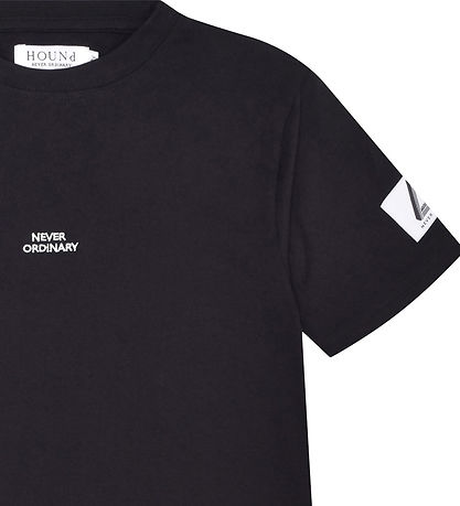 Nice Hound t-shirt in black with the text "Never Ordinary" embroidered on the front in white.