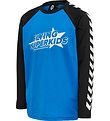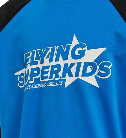 Cool Hummel blouse in black with a blue body. On the chest it says "Flying Superkids" in white, and down along both sleeves there are the characteristic shevrons in white.