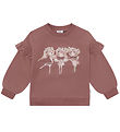 The Hust and Claire sweatshirt has long sleeves with wide ribbed edges and a round neckline with a narrow ribbing. The Sweatshirt opens over the left shoulder with two buttons in a wooden look. At the bottom, there are slits in the sides and the sweatshirt goes a little further down the back. It is made in a soft and stretchy cotton quality.