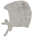 The Huttelihut baby hat has a round head shape and has flaps that go down over the ears. It is tied under the chin with a drawstring.