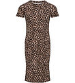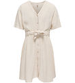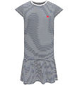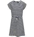 Stylish Kids Only dress with horizontal stripes in pink and white. The Dress has short sleeves, a round neckline and a drawstring at the waist. On the chest there is an embroidered palm tree in pink.