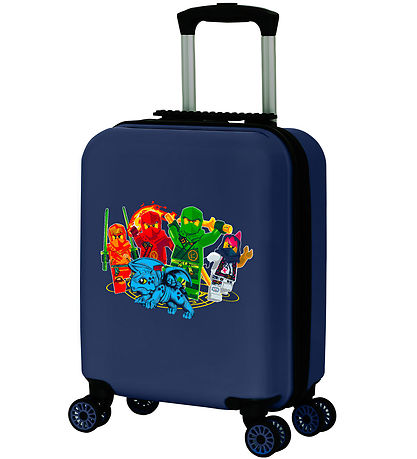 Cool LEGO® Ninjago cardboard suitcase in dark blue plastic with black details, and on the lid there is a large print with the ninjas Arin, Kai, Lloyd, Sora and the baby dragon Riyu.