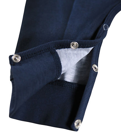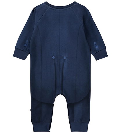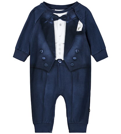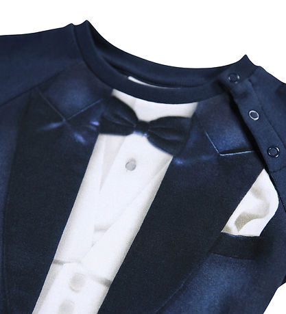 Stylish Molo jumpsuit in dark blue with a print, so the jumpsuit looks like a tuxedo with a shirt and bow tie. The Molo jumpsuit has long sleeves and legs with comfortable ribbed edges. The Jumpsuit from Molo has practical push buttons along the shoulder and between the legs.