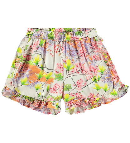 Fine Molo shorts in white with a vibrant floral print in shades of green, pink, orange and purple, creating an eye-catching look. The Molo shorts are a card model with a loose fit, and the trouser legs have nice ruffles. The Shorts have a wide elastic edge waistband, and there are practical pockets on the sides.