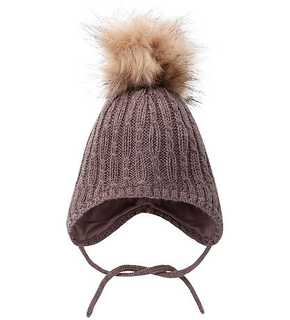The Name It beanie consists of two layers, of which the outer one is in a knitted wool quality, and the inner one is in soft cotton. At the ears there is an extra layer which makes the beanie windproof. The Beanie is tied with practical drawstring under the chin, and at the top there is a beige, removable pom-pom in faux fur.