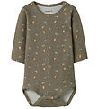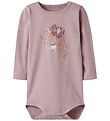 Charming Name It bodysuit with long sleeves adorned with a floral print in shades of purple, orange and blue. Name It has designed a bodysuit with fine lace details at the neckline, which adds a nice touch.