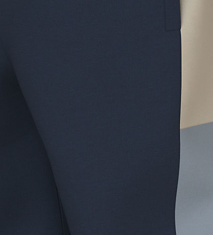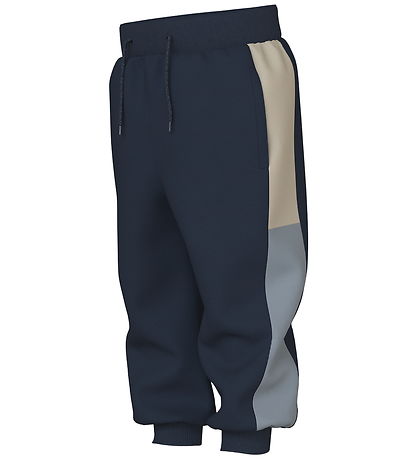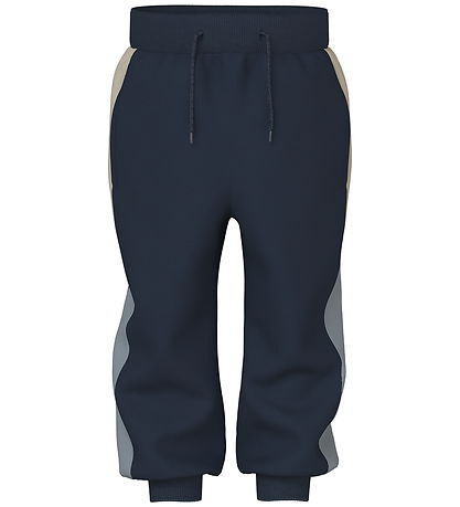 Beautiful Name It sweatpants in a deep dark blue shade with contrasting colors in light beige and grey along the sides. The model has a wide ribbed elastic edge waistband with decorative lace, ensuring a comfortable fit. There are ribbed edges at the ankles, and on the inside there is soft, brushed cotton.