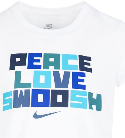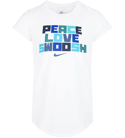 Adorable Nike t-shirt in white, with a large print on the chest of the text "Peace - Love - Swoosh" in shades of green, blue, grey and black, with a small logo print in grey underneath.