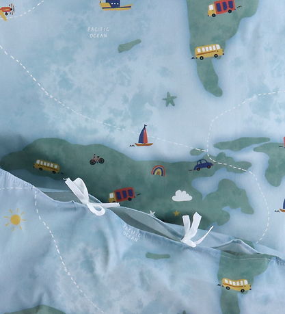 Smart Nørgaard Madsens bedding in shades of blue and green with an allover print of different countries and Have with many different transportation that explore the world.