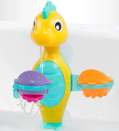 Cozy Playgro bath toy in the form of a yellow and light blue seahorse, which has several fun water play functions.
