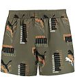 Stylish Puma swim shorts with a vibrant design in lime green and black, where "Puma" is repeated all over the fabric in a modern, graphic pattern.