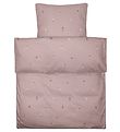 Fine Smallstuff bedding in dusty pink with an allover print of different dolls.