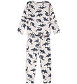 Fine That's Mine pyjama set in cream white with a crossed, dark green allover print of music-loving dinos.