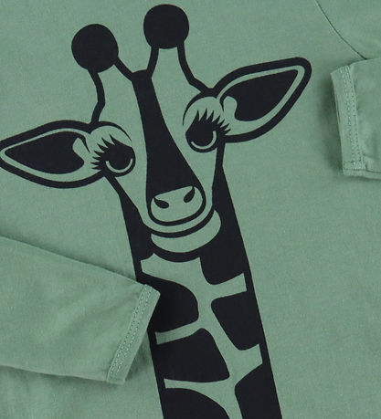 Charming DYR blouse in dusty green with a black print on the front of a giraffe. The DYR blouse has a round neckline and long sleeves with narrow edges.