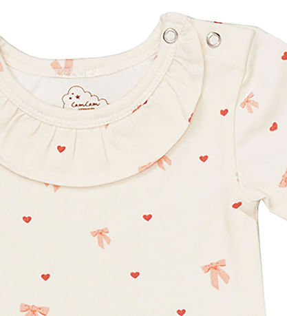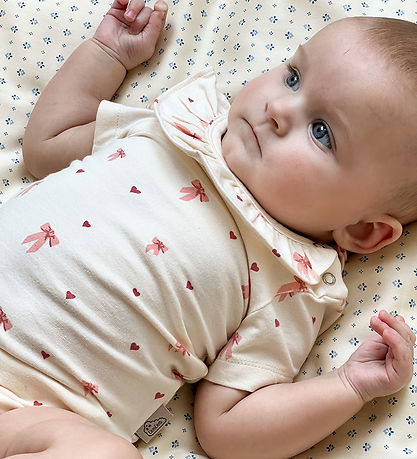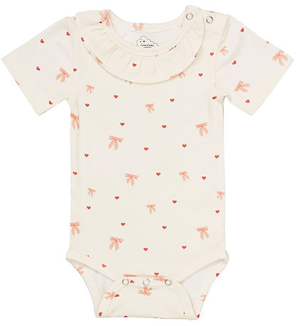 Cute Cam Cam Copenhagen bodysuit in cream white with a print of pink bows and hearts.