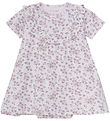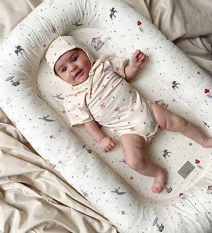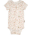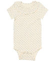 The Cam Cam Copenhagen bodysuit has short sleeves and a round throat with a wide ruffle and opens with push buttons on the left shoulder. It also opens between the legs with push buttons. The Bodysuit has narrow ribbed edges in the throat and the leg openings.
