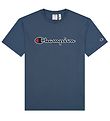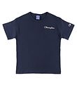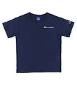 Smart Champion Fashion T-shirt in navy with a patch of the Champion logo in white and red with a black border on the upper left front and the well-known Champion C embroidered in black and red with a white border on the left sleeve.