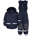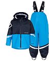 Nice Didriksons rainwear in blue and navy with a white logo at the top of the right sleeve. The rainwear consists of a rain jacket and a pair of rain pants with braces.