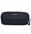 The Eastpak pencil case has a round and elongated shape with a flat bottom, and it opens at the top with a zipper.