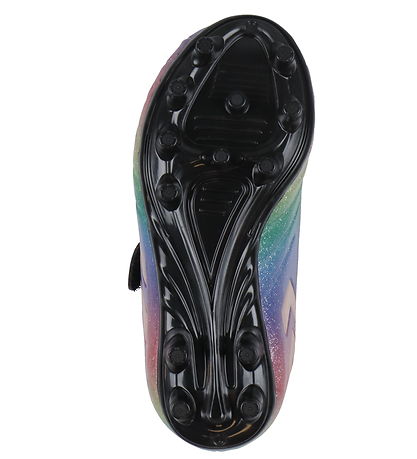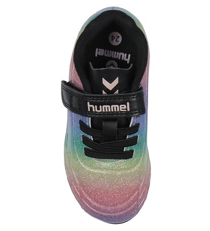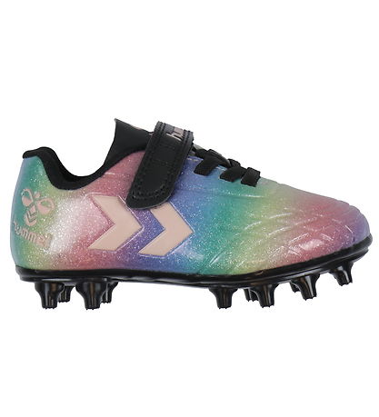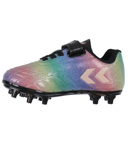 Smart Hummel football boots in nice changing colours with glitter. The football boots have Hummel shevrons on the inside and outside in pink, as well as nice details on the front. On the heel cap and tongue there are Hummel logos in pink, and the football boots have a smooth surface of imitation leather.