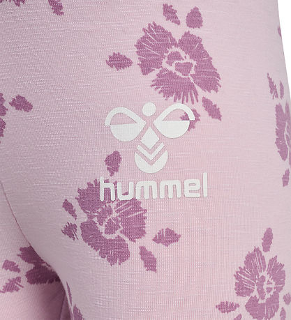 Fine Hummel leggings in dusty purple with an all-over-print of flowers in dark purple and a white logo print on the left trouser leg.