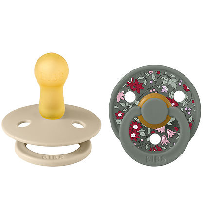 Beautiful BIBS x Liberty pacifiers, sold in a practical 2-Pack in gray beige and dusty dark green with a floral print in red, green, white and pink.