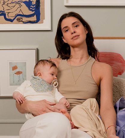 The BIBS x Liberty pacifiers have a round pacifier head made of natural rubber. The pacifier's shield is made of lightweight PP and has a circular and outward-facing design with practical air holes, so that nuisance from the moist environment and vacuum against the kid's skin is avoided.