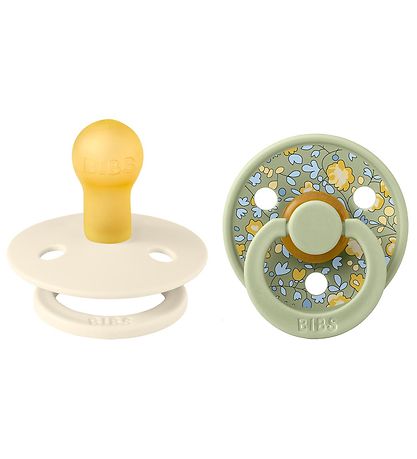 Beautiful BIBS x Liberty pacifiers, sold in a practical 2-Pack in beige and green with a fine print of flowers.