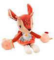 The Lilliputiens activity toys consists of two halves of an egg that can be pulled apart. A little chicken hides inside, which vibrates when you let go of one half of the egg. At the top there are two straps, so it is easy to hang it up and at the bottom there are two pieces of fabric that you can pull on.
