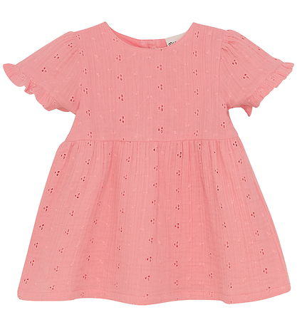 Cute Minymo dress in a soft pink shade with small embroidered details and a pointelle. The Dress has short sleeves with fine ruffle details and a slight flare at the bottom, which gives an impression of lightness.