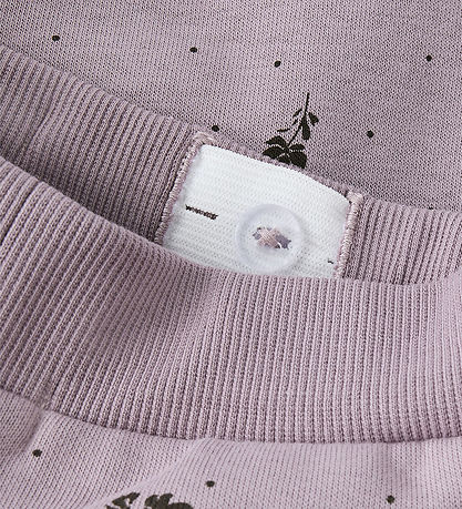 Beautiful Name It sweatpants with a delicate floral print on a light purple background. The sweatpants' design includes a wide elastic ribbed waistband with a decorative drawstring, as well as ribbed edges at the ankles, which provide a comfortable fit.
