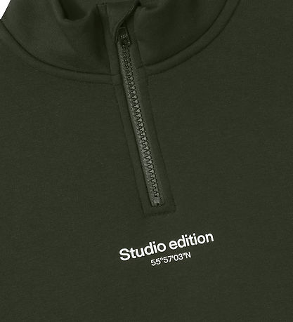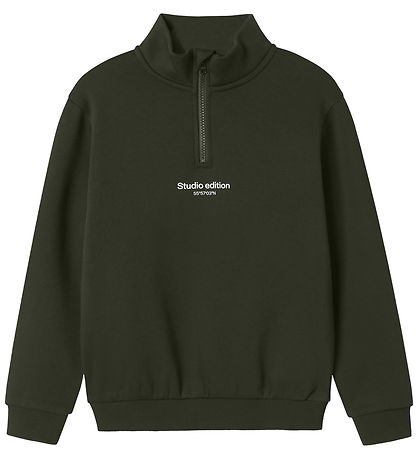 Beautiful Name It sweatshirt in a deep, dark green shade. The Name It sweatshirt has a practical zipper at the neck, which provides flexibility when dressing. On the front there is a minimalist white print with the text "Studio edition". The Sweatshirt has long sleeves, and both the wrists and the waist are finished with a wide ribbed edge, which ensures a good fit.