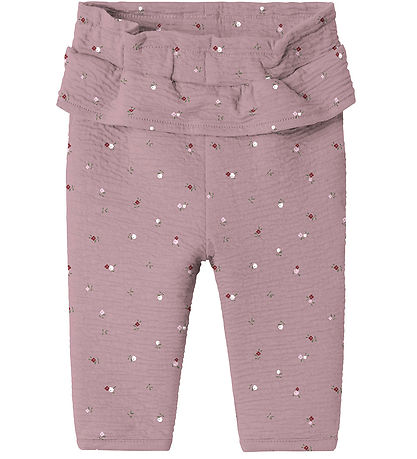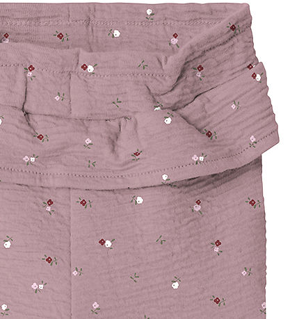 Lovely Name It trousers in a beautiful lilac shade with a discreet structure and delicate floral prints. The Trousers have a cute ruffle edge at the waist, which adds a feminine touch to the comfortable design.