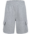 Stylish Nike sweat shorts in grey melange with practical open pockets on the sides and flap pockets with Velcro closure on the outside of the legs. On the left flap pocket there is a white logo embroidery.