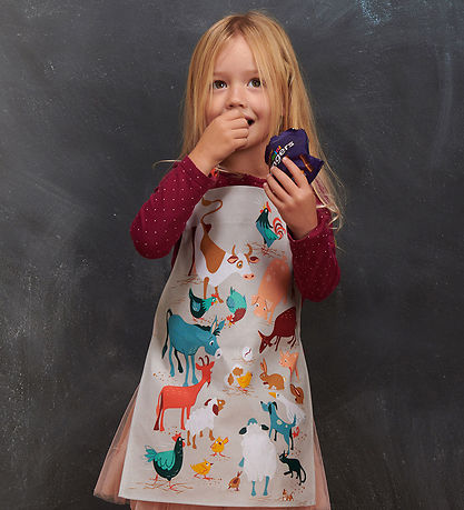 Nice ThreadBear apron in beige with orange straps and with a colorful print of cute farm animals.
