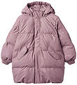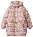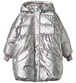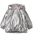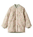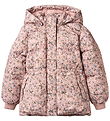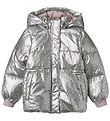 Lovely Wheat puffer jacket in a shiny silver color with an allover floral print in dusty purple, pink and green colours.