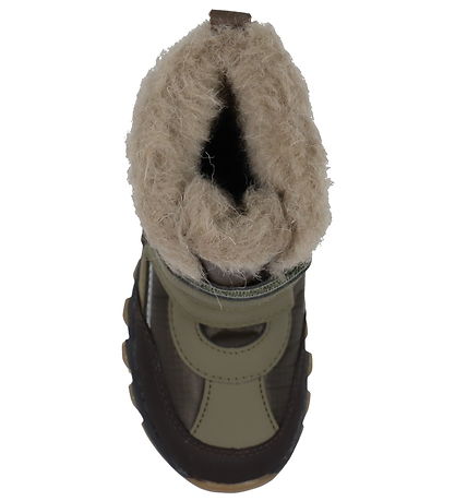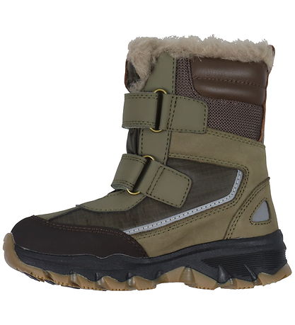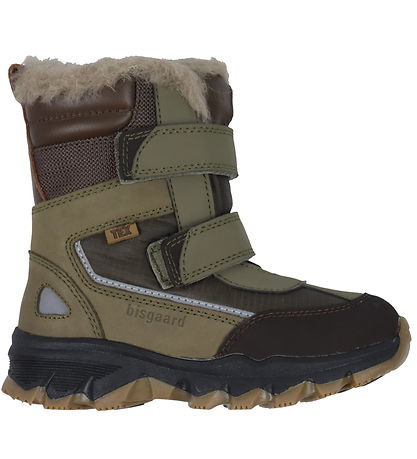 Smart Bisgaard winter boots in dark green and brown leather and textile, with practical reflective details.