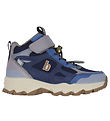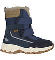Nice Bisgaard winter boots in blue and gray leather and textile with embossed logos on the tongue and the Velcro strap.
