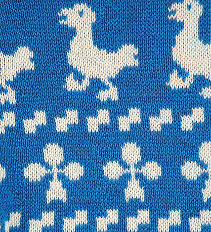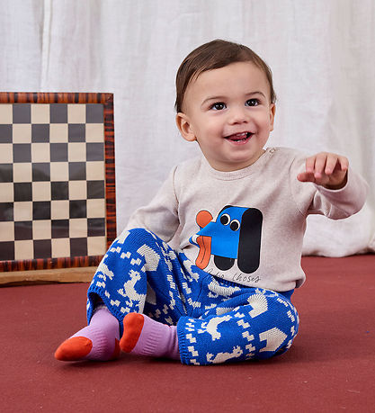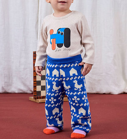 Beautiful trousers from Bobo Choses in a ready blue knitted with a beautiful knitted pattern of white motifs of houses, animals and flowers.