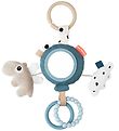 The Bright Starts suspension hangs in a turquoise plastic ring, so it can be hung on the kid's play gym, on the pram's canopy or similar. When the suspension is moved, it makes an exciting sound, and the suspension is exciting and fun for the kid to play with.