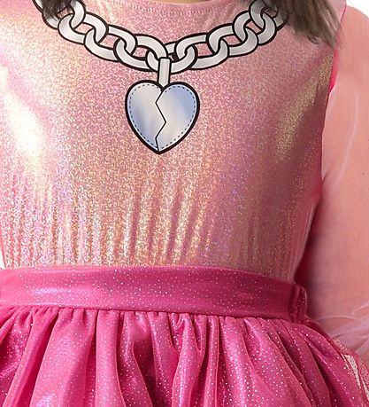 Smart Ciao Srl. costume consisting of a glitter blouse, skirt and a pair of pink heart-shaped sunglasses. The Blouse has a print, so it looks like it has a necklace on, and the sleeves are transparent in pink tulle with glitter in it. The belly of the blouse is in a shiny print with multicolour glitter. The Skirt is in pink and purple tulle and glitter with ruffles.