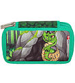 Fine Jeva pencil case with an all-over-print of fish scales in green and blue shades and with pink details. On this side is printed a mermaid knight on a green seahorse.