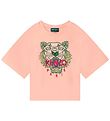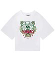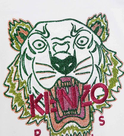 Beautiful Kenzo t-shirt in white, and on the front there is a large, roaring tiger embroidered in shades of green as well as orange, white and pink with glitter. Above it is written "Kenzo Paris" in pink letters with glitter.
