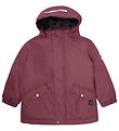 Smart Mikk-Line winter coat in plain, dark purple with practical reflective prints and a cool light function.
